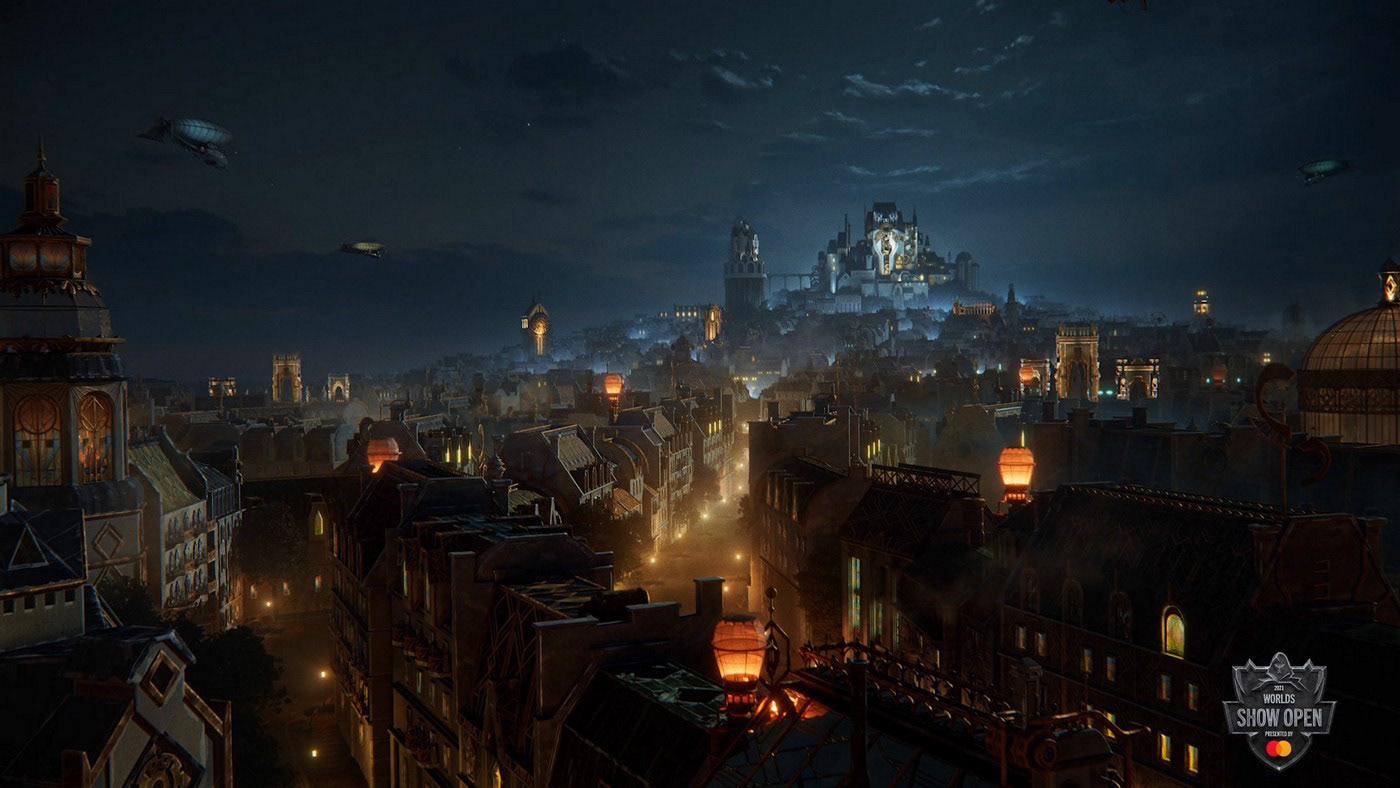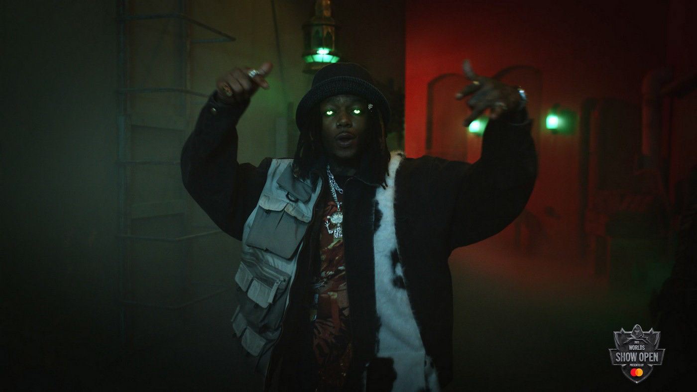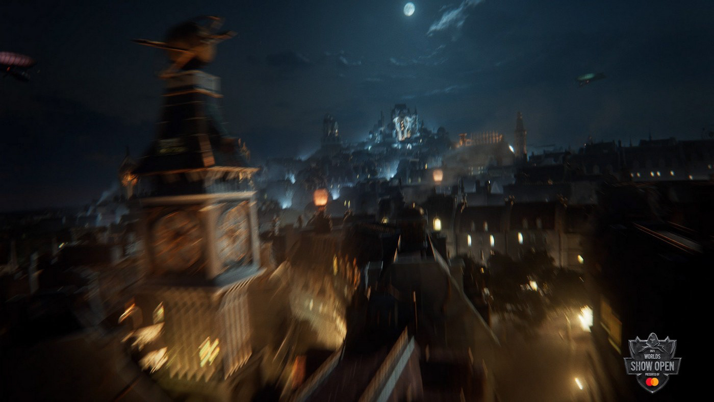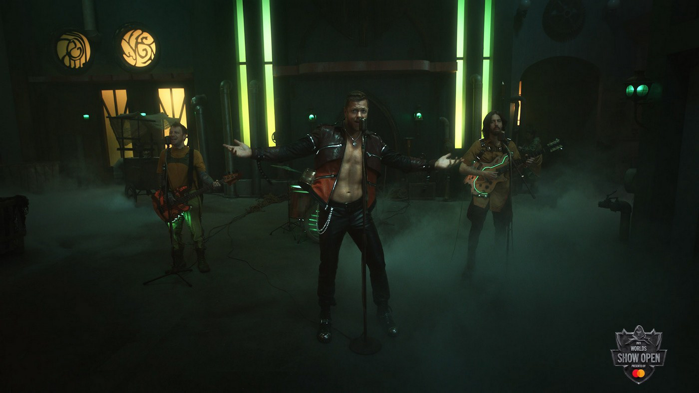 The spillover from Jinx's actions ripple out across Zaun, opening a turbulent Hextech portal that transports us from the cavernous undercity to the glittering wealth and soaring skies of Piltover above. We fly over the procedurally-generated cityscape to land within the council building and its halls of power. Lynn Gunn of PVRIS performs as Piltoveran citizens face off against displaced Zaunite dancers. Denzel Curry activates a Hextech sphere in Jayce's lab, finally taking us from the world of Arcane to the world of the esport competition, where pro teams Edward Gaming and Damwon Kia prepared to face off on the game's biggest stage.